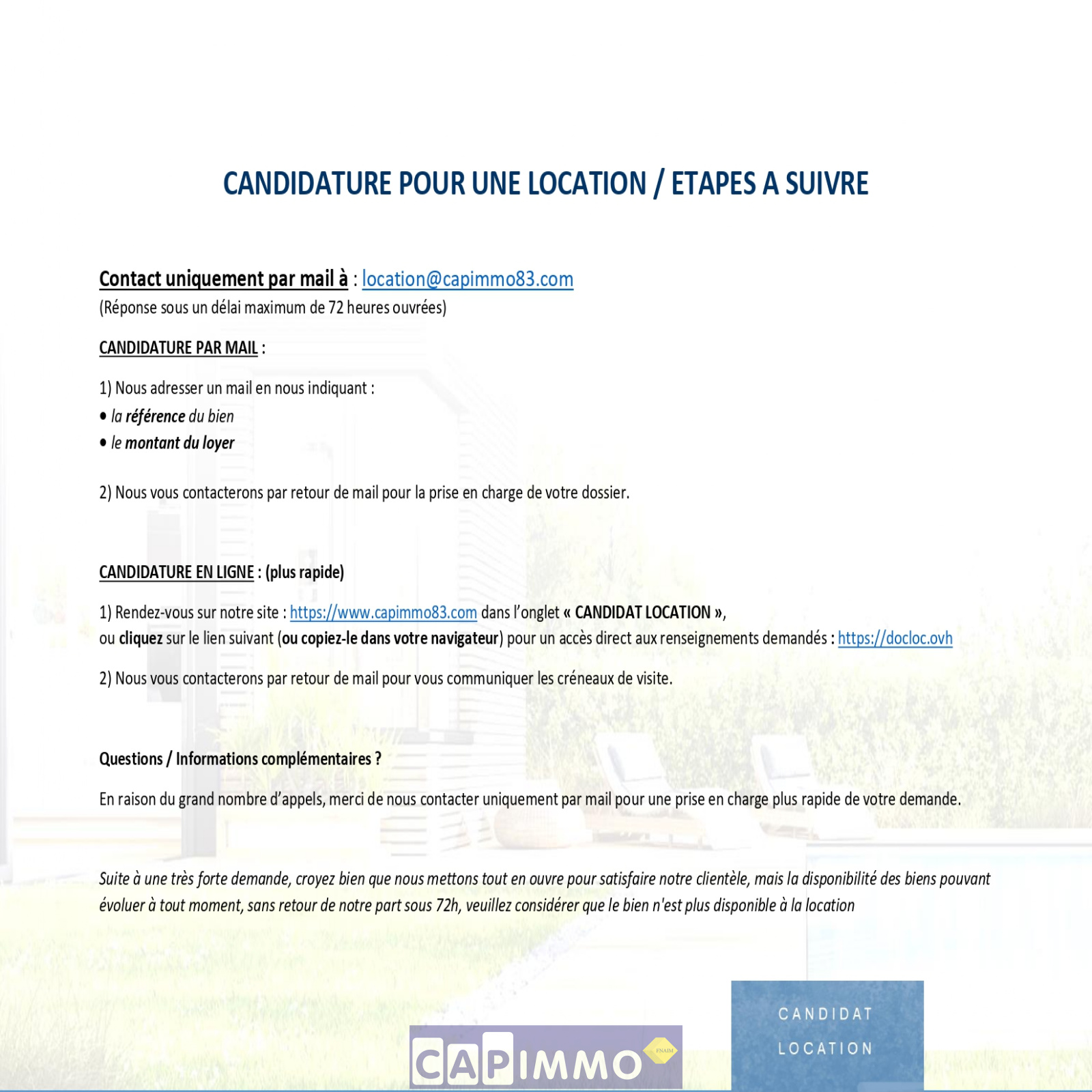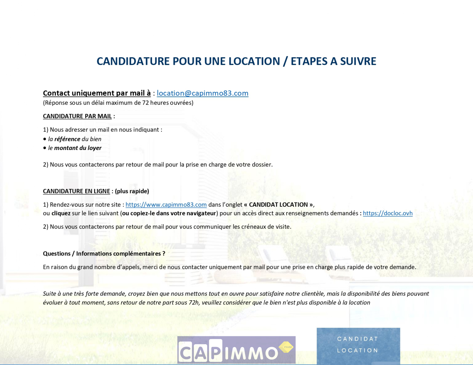 Pour plus d'informations ou pour organiser une visite n'hésitez pas à nous contacter: Contactez PAR MAIL NOTRE SERVICE LOCATION: location@capimmo83.com (les contacts téléphoniques ne sont plus traités en raison d'un nombre trop important d'appels. Nous vous remercions de votre compréhension).
