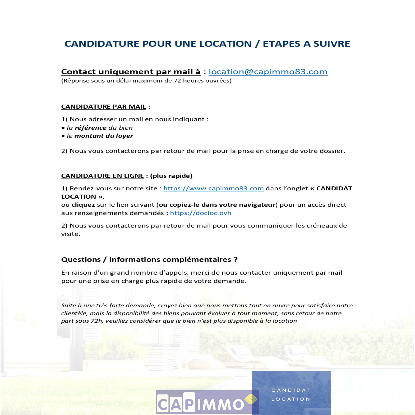 Pour plus d’informations ou organiser une visite : contacter exclusivement par mail notre service location : location@capimmo83.com.