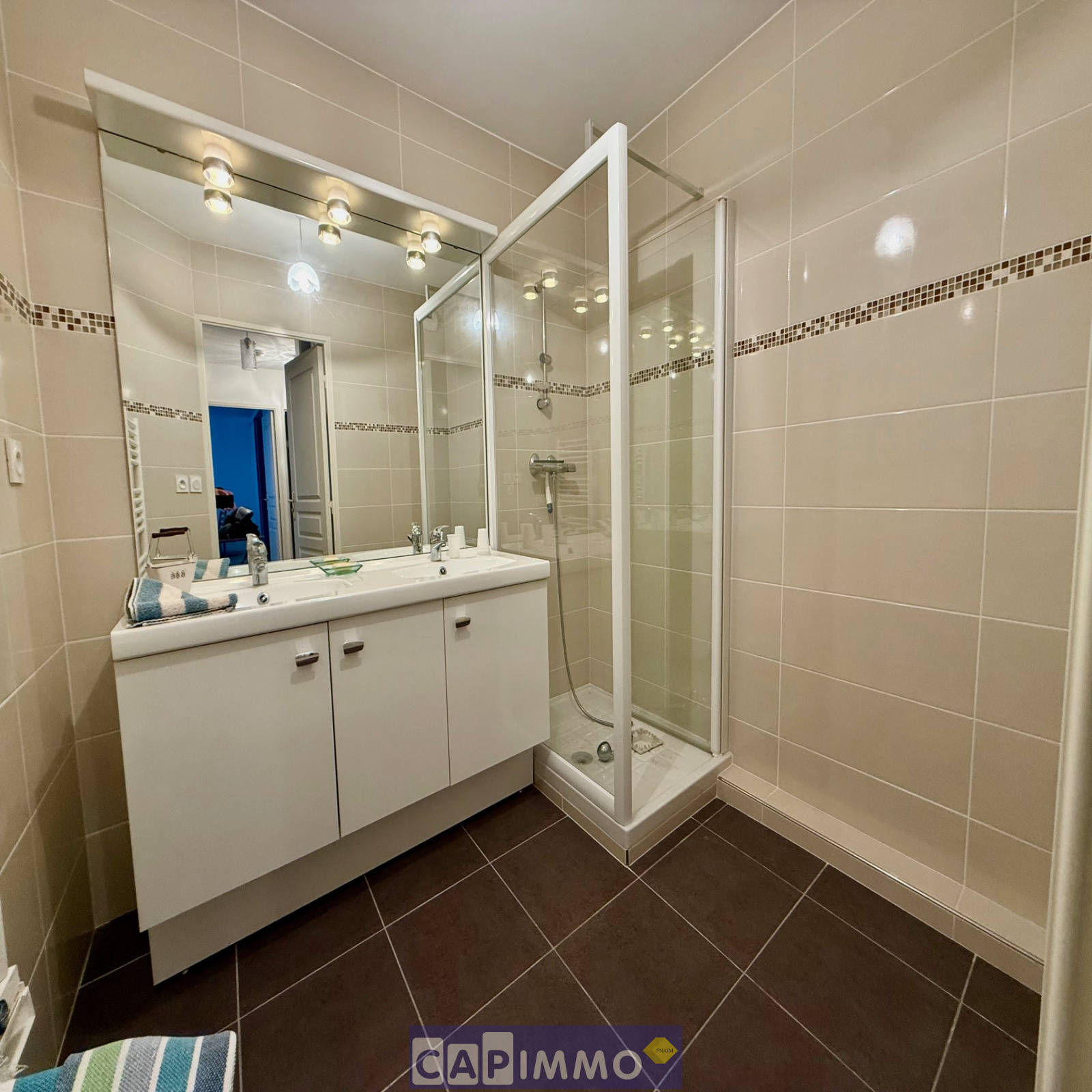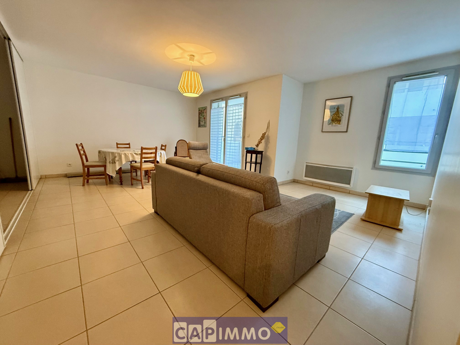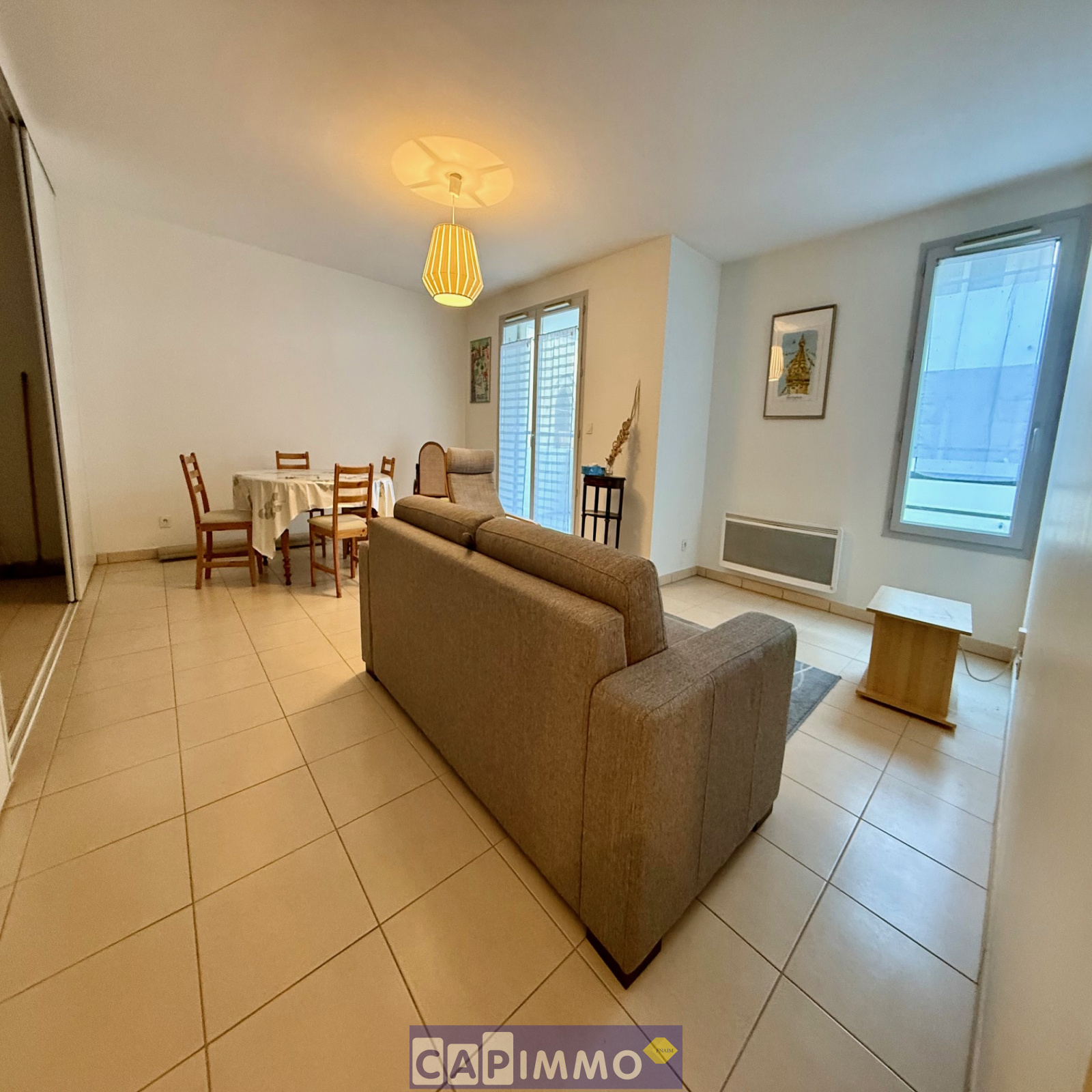 Composé: Hall avec placard, Salon-Séjour avec cuisine américaine tout équipée, Deux Chambres dont une avec placard, Salle d'eau et wc. Le tout aux normes PMR